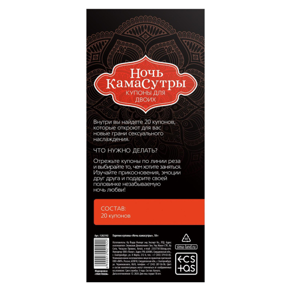 Горячие купоны Ночь камасутры — отличный вариант для романтического свидания. Ужин давно позади, обстановка располагает к близости, но хочется еще немного продлить томление? Игра быстро затянет вас и доставит истинное наслаждение. Вам предстоит выполнять задания и получать награды, которые вам наверняка понравятся. Оставьте онлайн-заказ, и долго ждать доставки не придется (работаем по всей России).