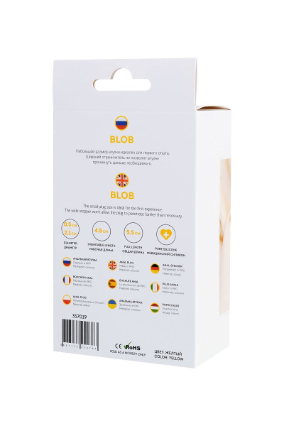 Желтая анальная втулка Blob - 5,5 см. – яркая модель с интересным дизайном, с помощью которой можно реализовать различные эротические фантазии, отдавшись водовороту страсти и забыв об условностях. Нужно лишь слушать свое тело, и тогда удовольствие станет ярче и острее. Желтая анальная втулка Blob - 5,5 см. и другие игрушки созданы из безопасных и гипоаллергенных материалов. Единственным условием является использование подходящей смазки, которая не станет причиной порчи продукции.