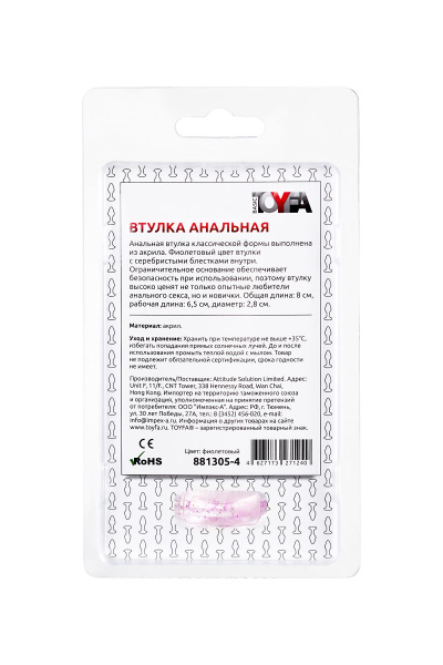 Фиолетовая акриловая анальная втулка - 8 см. – яркая модель с интересным дизайном, с помощью которой можно реализовать различные эротические фантазии, отдавшись водовороту страсти и забыв об условностях. Нужно лишь слушать свое тело, и тогда удовольствие станет ярче и острее. Фиолетовая акриловая анальная втулка - 8 см. и другие игрушки созданы из безопасных и гипоаллергенных материалов. Единственным условием является использование подходящей смазки, которая не станет причиной порчи продукции.
