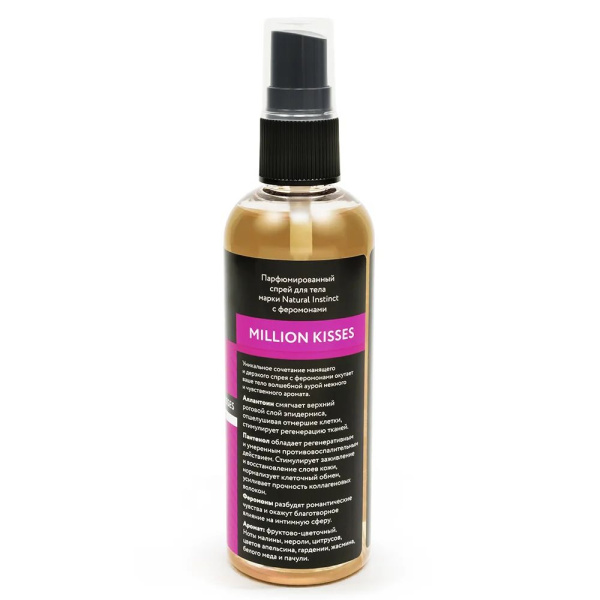Парфюмированный спрей с феромонами Million Kisses - 100 мл. – уникальное средство, благодаря которому интимные ласки станут незабываемыми, возбуждение возрастет до небывалых высот, а каждое прикосновение будет посылать дрожь удовольствия по телу. Оно гарантирует яркий фейерверк эмоций, посылающих за грань наслаждения. Парфюмированный спрей с феромонами Million Kisses - 100 мл. – абсолютно безопасная для здоровья продукция, не содержащая вредных компонентов. Осуществляется быстрая доставка товара по России с соблюдением строгой конфиденциальности.