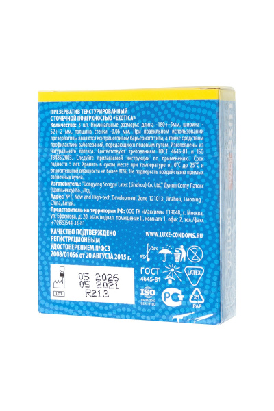 Текстурированные презервативы LUXE Royal Exotica - 3 шт. — надежная защита, обеспечивающая комфорт во время полового акта. Кондом создан из качественного материала высокой прочности, но при этом не притупляет ощущения от проникновения. Близость будет яркой, а удовольствие максимальным. Оставляйте заказ на сайте, доставка товара по России будет организована очень оперативно.
