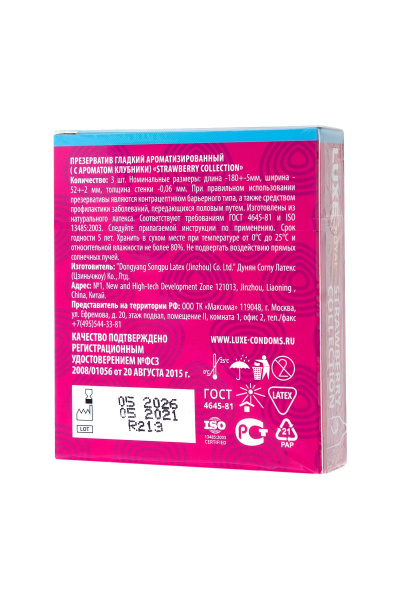 Презервативы с ароматом клубники LUXE Royal Strawberry Collection - 3 шт. — надежная защита, обеспечивающая комфорт во время полового акта. Кондом создан из качественного материала высокой прочности, но при этом не притупляет ощущения от проникновения. Близость будет яркой, а удовольствие максимальным. Оставляйте заказ на сайте, доставка товара по России будет организована очень оперативно.