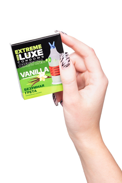 Стимулирующий презерватив «Безумная Грета» с ароматом ванили - 1 шт. — надежная защита, обеспечивающая комфорт во время полового акта. Кондом создан из качественного материала высокой прочности, но при этом не притупляет ощущения от проникновения. Близость будет яркой, а удовольствие максимальным. Оставляйте заказ на сайте, доставка товара по России будет организована очень оперативно.